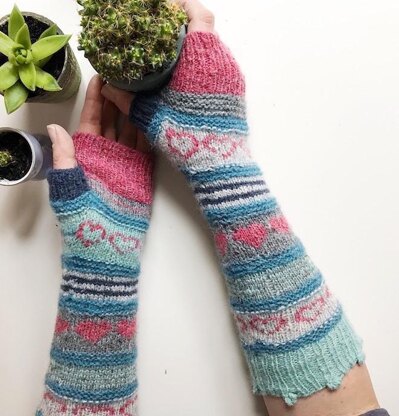 The mitts are designed to have fun with all your leftover yarns. Just use all the colours you like and make a colourful mix.