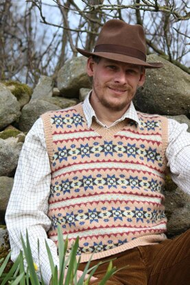 This very popular pattern was based on a sleeveless pullover worn on BBC TV's Wartime Farm series by one of the presenters, Alex Langlands. The garment worn on the show was a recreation of a pattern from the 1930s. This stylish pullover features two recurring motifs, the main motif incorporates the popular OXO pattern and eight pointed star, interspersed with an attractive peerie motif, with simple triangles for emphasis. The colours used are based on those suggested in the original 1930s pattern.