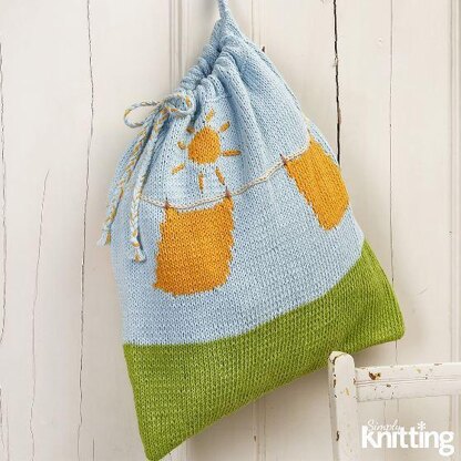 This is a pattern for a washing line laundry bag, originally published in simply Knitting. It has instarsia motifs, with chain stitch embroidery. It could also be used as a toy bag. Photo Simply Knitting.