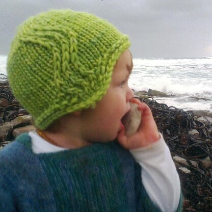 This pattern is a celebration of his love for water. It is the perfect hat to wear while watching his brothers surf. The waves in the design run down the hat and onto the ear flaps over his ears.