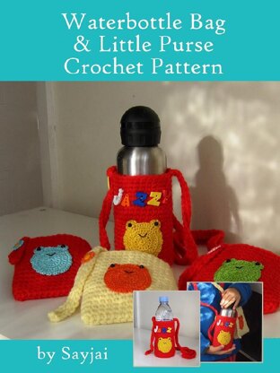 Crochet pattern to create a waterbottle holder and a little purse for children. The water bottle bag fits most small water bottles and mugs. The bags have an adjustable strap.