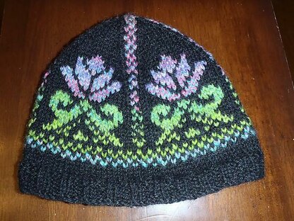 The water lily was my favorite flower growing up. This hat was designed with matching Water Lily Mittens for my young daughter with colorwork elegant enough for a woman (I've been known to borrow the hat...). The pattern shows off hand dyed tonal or variegated yarns beautifully, and is a great way to use up some small amounts of handspun treasures!