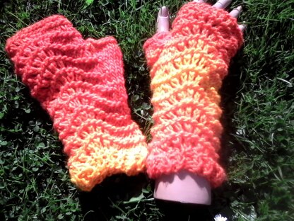 This is a knitting pattern for a pair of fingerless gloves. It is knitted in the round with Chunky yarn.