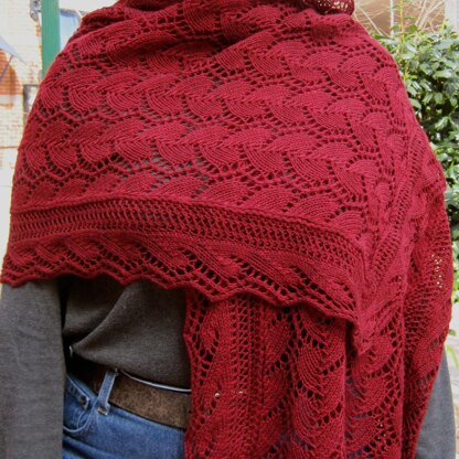 This wrap is knitted in the traditional "Shetland Shawl" method, with a knitted on edging. However, since it is made with heavy fingering weight (light sport weight yarn), it is a much faster project. Nor is the lace in either the main wrap stitch or the edging stitch particularly difficult for a veteran lace knitter.