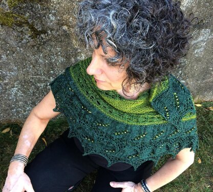 This crescent-shaped Waves and Brambles Shawl in one, two, and three-color versions combines texture, garter stitch, short rows, and leafy beaded lace in a delightful knit. Worked top down in garter stitch stripes from a cast-on the width of the shawl, the sideways Beaded Wave Edging is then added. I hope you enjoy every stitch!