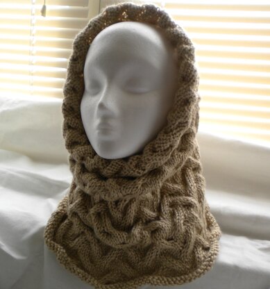 A knitted cowl /hood. I recommend making this luxurious wavy cable stitch in a soft yarn. The pattern includes 2 sizes. Worked in the round. Sizes: S/M and M/L. 25" circum x 17" long (27" circum x 20" long. Skill Level: Easy. Yarn Weight: Medium Worsted. Knitting Needles: US 8