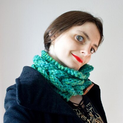 Long before I have started knitting, I already customized most of my shirts. T-shirt modders often use a technique called ‚weaving‘, where they shred parts of the shirt into stripes and ‚weave‘ them artfully back together. I borrowed this technique for this super chunky cowl design. (No need to shred anything here, though.) The outcome looks a little like knitted cables, but you can simply achieve this look by casting on and binding off knit and purl stitches.