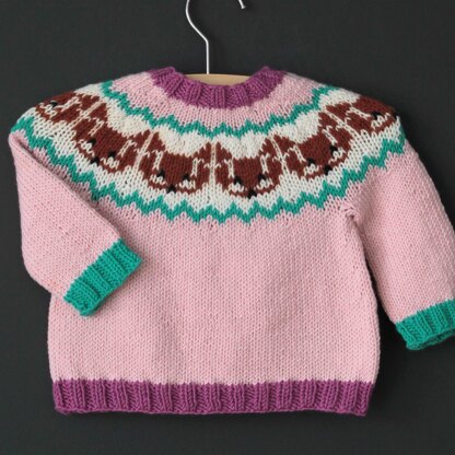 This garment is knit seamlessly from the top down, featuring a stranded colorwork section around the yoke. The pattern gives the option to work a few short rows at the back neck for a more fitted neckline (this step is optional). The yoke is worked in the round to the underarms, then the sleeves are put on hold, and the body is worked in the round to the hem. Lastly, the sleeve stitches are returned to the needles and worked in the round to the cuff. The eyes and noses of the foxes are worked in duplicate stitch (link to tutorial provided).