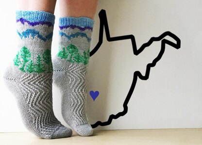 West Virginia is a state full of windy roads, forests, cozy mountains, and cabins by the creek. The people who call WV home are an independent, but close knit population, that love pepperoni rolls, buckeyes, and everything outdoors! This sock design combines twisted stitches to represent the windy back roads, and Fair Isle charts for the forests, mountains, and skies.
