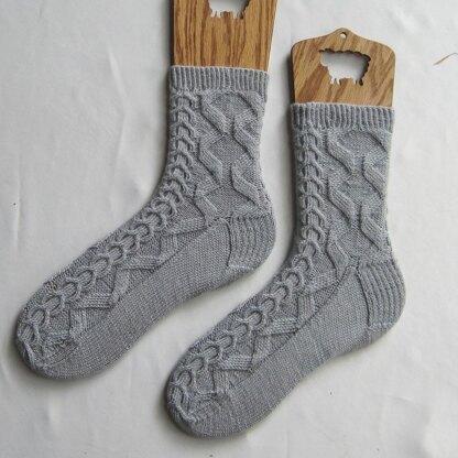 This is a pattern for a pair of socks that is knit from the top (cuff) down on two circular needles, with an optional 12-inch needle. The socks themselves are created using two different Alpine Cable stitches, so that cable knitters will love them. The cables will add both a little warmth and durability to the socks, as well as show off your knitting prowess.