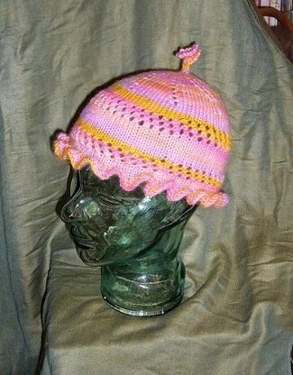 Whirligig is a hat designed for a small child. It has a neat frilled brim and a simple eyelet pattern that works well with brightly hand-painted yarn. The swirling eyelets in the crown converge on a short section of i-cord topped with a jaunty spiral decoration. This hat is a quick, easy knit and requires only basic knitting skills: