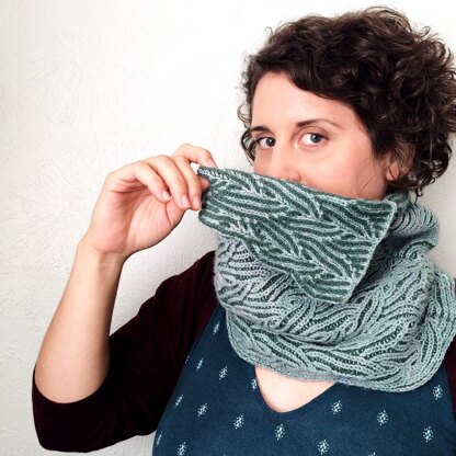 Every cloud has a silver lining :: Whisp is an asymmetrical cowl with wind and cloud lace, knit using the two-color brioche stitch. This cowl is worked flat, starting at the widest end and then decreasing slowly at one edge until binding off. The cowl is then seamed together, with the angled side creating a folded fabric to show off the Contrast Side, keeping the soft SilverSpun® cotton on your skin at all times.