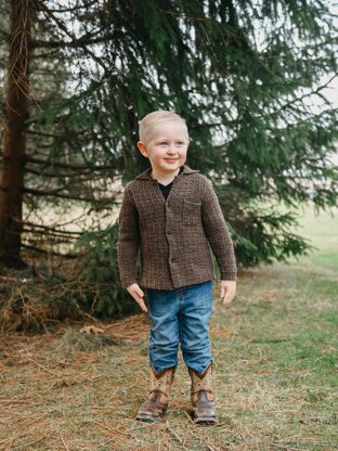 A boy’s field jacket or vest in nine sizes to knit in an allover tweedy textured stitch, with button front, set-in sleeves (vest has ribbed armhole trim), chest pocket, side hem slits, and shirt collar. All pieces are knit flat, bottom up, and seamed.