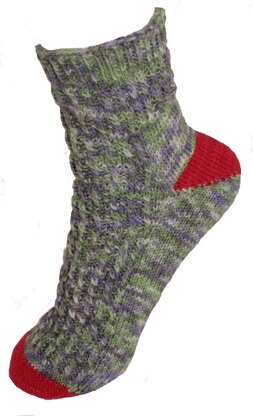This sock is knit from the toe up but can easily be altered to be knit top-down. An alternate skein is provided for the toe and heel.