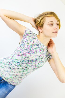 The top is constructed by knitting two identical squares in the bias and seaming them together, with some finishing touches worked in garter stitch. The nature of bias fabric will cause the top to curve inwards, for a fun and cute fit!