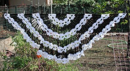 Brand new skull design worked from the top down. Make the shawl in any weight yarn. Make as many rows as you like to get to your desired size. The sample pictured was made in Red Hear Super Saver Yarn. I used 1 skein for the web, and 2 for the skulls. It measures 61 inches at the top, and 27 inches long, at mid point. Lower ruffled edge measures about 180 inches