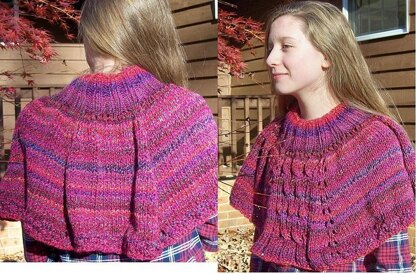 Top-down using approx 340 yards heavy worsted yarn (sample shown uses one skein of Duo, a gorgeous acrylic yarn from Swedish Yarns), this capelet is fun to knit – all stockinette except for the cabled panel down the center (which keeps the knitting fun and interesting).