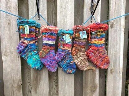 The slipper socks in this pattern are the result of ten years, and hundreds of pairs of socks, and I love them. Because they are made on size 5mm (US 8) needles, they are much faster than many sock designs, and they allow for much thicker yarn. The downside is they are so thick, they tend not to fit into boots or shoes, though some folks wear them in oversized rubber boots or clogs. A few folks even asked me to add leather soles, so they could wear their socks on the porch.