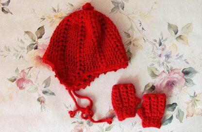 Hat & mitts set for spring or autumn. Picot edging and the little flower on the top of the hat makes it so cute and girly. Fingerless gloves gives children the opportunity to play and touch everything with their hands, which they love so much.