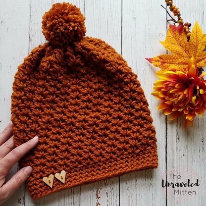 The Wildwood Slouchy hat is worked in rounds from the bottom up using simple stitches to create a fun diagonal pattern. Top it off with a pom pom and add a fun button to make your hat extra special.