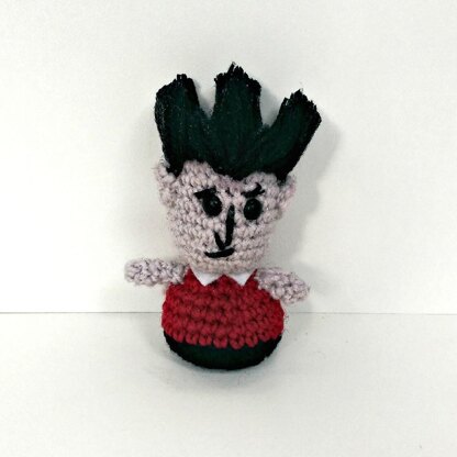 You can make him with: - 3.5mm hook - 8ply acrylic yarn in red, black and skin colour - stuffing - 9mm blacks safety eyes - black embroidery thread - craft glue.