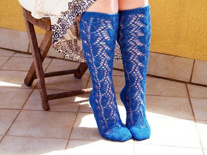 Cheery lace knee-highs are the perfect things to brighten up a Spring and Summer outfit. Lace carries all the way around the foot to create a very stretchy sock that will easily fit a variety of sizes. This pattern is ideal for trying on as you go, and calf shaping and elastic make sure that these stockings stay in place.