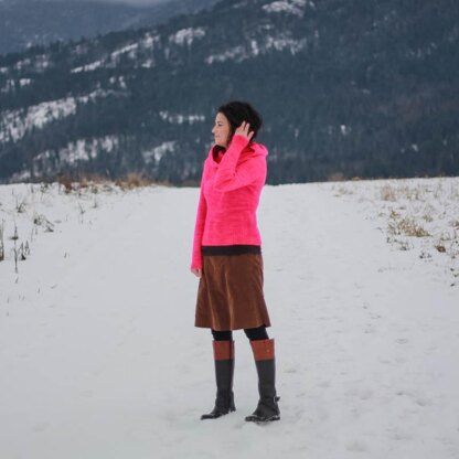As Winter becomes harsher, you need something to protect you from those icy winds. Something simple, easy to wear. Yet at the same time warm, dense, and, should the need arise, with a hood for emergencies! (During the snowy photoshoot, this sweater was the winner for warmth. The hood piles up like a cowl and is very effective at keeping your neck warm… the other sweaters were not so much so. Once their photos were done, this one was the one to wear for the long walk back to the car!)