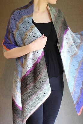 This reversible shawl of feathery lace and rippling garter combines two complementary color gradients and a neutral gradient, spiced up with a few accent colors. A timeless wrap for any season. Texture + color = fun + beautiful.