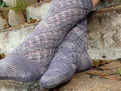 A pretty diagonal lace pattern winds down the leg and over the top of the foot in these dressy top-down socks for three sizes. Knit with a fine yarn for a thinner fabric, these will feel closer to a stocking or trouser sock, but with a cozy warmth and sturdiness for all-day wear. Substituting yarn and/or needles may result in an overall variation in size.