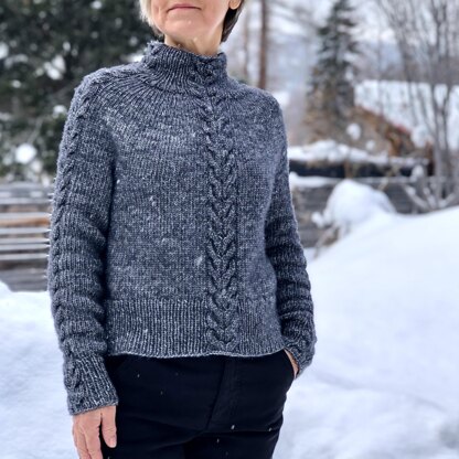 It is worked seamlessly in the round, from the top down starting with the collar. The yoke is shaped with evenly spaced increases in between the cable panels. At the bottom of the yoke, short rows are worked to raise the back, and at the same time raglan increases are worked in order to complete the increases needed, as well as adding a few more sts to the front relative to the back of the sweater.