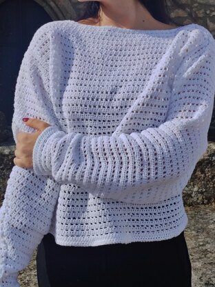 Windy crochet sweater is a warm sweater for autumn days, made of cotton with a cute and simple lace pattern. Slightly oversized, the sweater has a boat-shaped neck and balloon-shaped sleeves that give you comfort and make you feel cozy while adding a trendy touch to your looks.