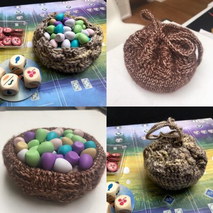 This is a two-in-one egg dispenser and storage bag for eggs in Elizabeth Hargrave’s acclaimed board game WINGSPAN. It’s meant to hold the eggs and act as a dispenser during gameplay while doubling as a storage bag when you pack the game up. There’s enough space in the box to hold the main game, first expansion and this nest with the eggs inside. As you can tell from the image underneath, the bag also holds the expansion eggs.