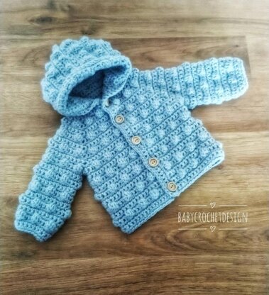 This is a crochet pattern to make a cute baby bobble cardigan or hoodie This cardigan is worked in one piece starting from the top and working down, then joining to make the sleeves and edging and also has the option to make it hooded