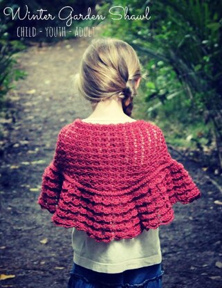 This pretty, feminine shawl may be made using yarn type and hook size of choice with excellent results. It may also be made to any size. The pattern includes a standard size chart with suggested measurements for sizes 2T to Ladies XL.