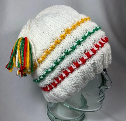 One size fits most A new way to keep your head warm this Holiday season! A clean, uncluttered look, with Holiday color textured stripes in the hat of a white background. This would also be very pretty in a light blue hat, with white and denim blue stripes.