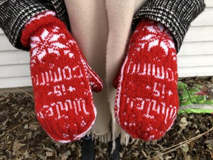 This is a pattern for Winter is Coming Mittens. The palm side of the mittens have a detailed colorwork pattern. The backs of the mittens say "Winter is Coming" with a snowflake pattern.