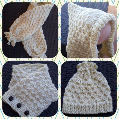 set of four items for children incorporating pull-on hat, neck warmer, scarf and hooded scarf all in a delightful honeycomb pattern. Knitted in a soft aran this is sure to keep the little ones warm during the cold winter moths.