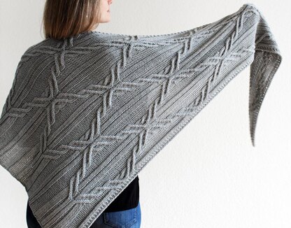Winter Serenade is an eye-catching triangular shawl with a beautiful large cable motif that swings across the body and transitions into a wide ribbed border.