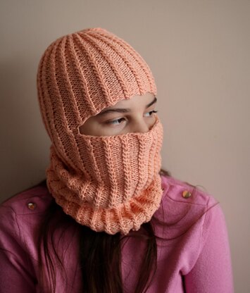 The balaclava is knit in the round.