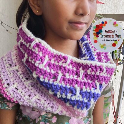 I have used Ganga Alisha/ Puound of Happiness and equal weight striped multi colored yarn (Ganga Smarty) in alternate rounds to create the Cowl.