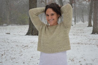 Winter Surf is a beach-inspired cropped sweater, a perfect bohemian piece for layering over tunics and fitted tees throughout all seasons. Designed with several inches of positive ease in the bust for a comfy fit, a classic drop shoulder, and fitted sleeves. Knit flat in pieces and seamed. The allover lace pattern makes it an engaging knit and gives the finished piece a summery, free-spirited feel. Knit up in Plucky Knitter Lodge Worsted it is a quick knit and the fabric created makes for a sweater that can be enjoyed year round! This is a great simple design for first time sweater knitters. Options for a more sophisticated tubular bind on and off are included in the instructions.