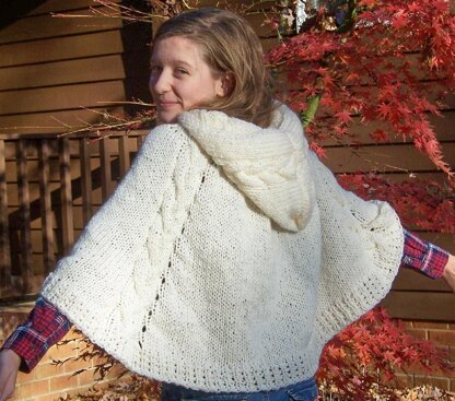 Starting at the generously cozy hood, the braided cable follows the shoulder line (with increases either side) down to the broken-rib hem. You will work an applied i-cord edging on the hood as you go. Once the hood is finished, you'll work the poncho in the round. If you'd like to make a cape (that opens), don't join and continue the i-cord edging that you've established