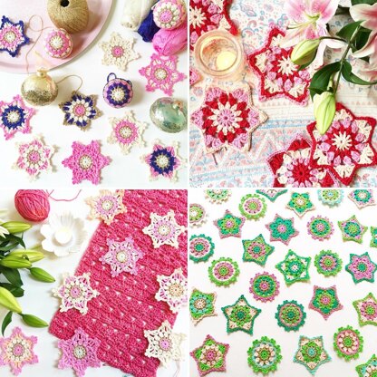 There are lots of ways of using these pretty patterns. Of course you can hang them on the Christmas tree, maybe make a garland or use them as present toppers! I’m using the Six pointed star pattern to create a Christmas throw, using chunky yarn. I also think they would make lovely coasters around the home to bring some festive cheer!