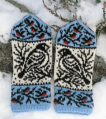 Wintery birds mitten pattern with the thumb gusset. The mittens are knitted using just two colors at a time, the birds chests are embroidered with duplicate stitch afterwards.