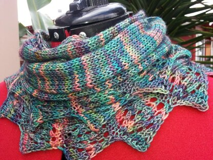 this loop is especially easy to knit. I would recommend it for slightly experienced knitters that are ready to try lace for the first time. The repeat is easy and the effect of the yarn colors with the lace border is magnificent.
