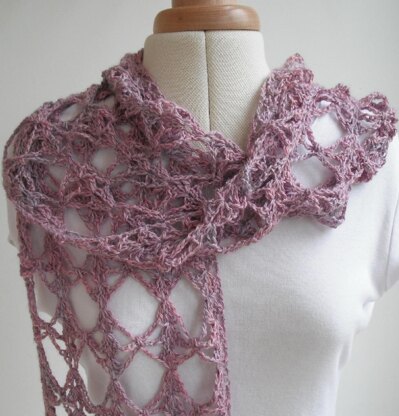A lacy crochet scarf that grows very quickly and takes only one 100g skein of 4 ply/fingering weight yarn. As made to the pattern the scarf measures 30cm wide by 200cm long when blocked. A skinny version approx. 15cm wide would take half a skein or 50g of 4 ply/fingering weight yarn. A stole approx. 45cm wide would take 150g. The pattern is easily adapted to any width or any length. Alternatively it can be adapted to any weight of yarn provided you use a suitable hook size. An example of a skinny scarf in Rowan Savannah (aran weight) using approx 125g is also included. Written in English and US crochet terms