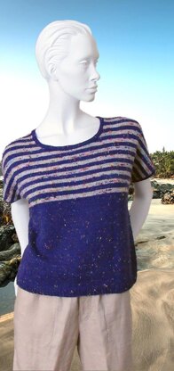 Worked in the round from the bottom up, the stripes begin when you start to shape the underarms. After dividing the front and back, increase a few stitches at each armhole edge to shape the cap sleeve. Short-rows are used to shape the shoulders, which are then joined using Three-Needle Bind-Off. Narrow bands of k1, p1 rib edge the neck and armholes.