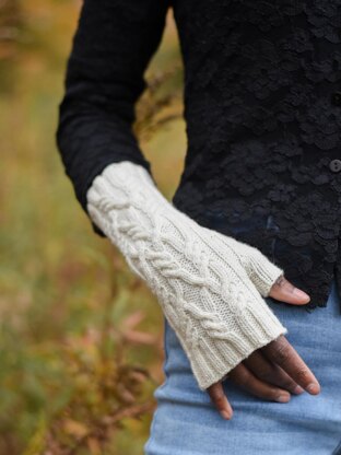 A rich tangle of intertwined cables adorns the back of these sport weight fingerless mitts in two sizes (S/M and M/L). But don’t be fooled by the visual complexity—the pattern is composed entirely of simple, repetitious cable crossings that are easy to keep track of and execute. The allover cable-and-rib fabric and a tailored thumb gusset provide a snug fit that stays in place, while the cable texture continues up the longer cuff to look great with pushed-up sleeves. The reverse side is worked in rib from bottom to top. Instructions are easily adjusted to be worked on two circular needles if desired.