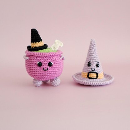 The cutest Halloween duo! A kawaii style Cauldron with a small witches hat and bone poking out the top, and an adorable lilac Witches Hat. What’s not to love?!