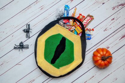 Crochet your little one a truly unique trick or treat bag this Halloween! Easy wolf eye pattern using single crochet and cotton worsted yarn (polyester worsted also works) makes a fun bag for trick or treating. Also makes a great market bag for a witchy woman!